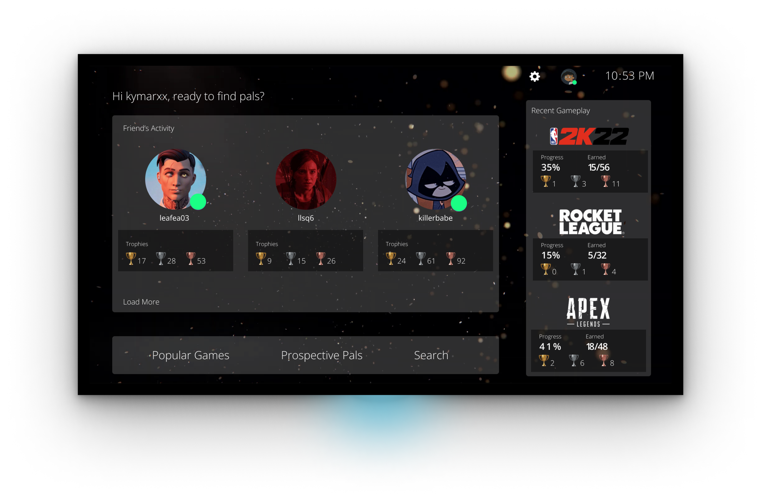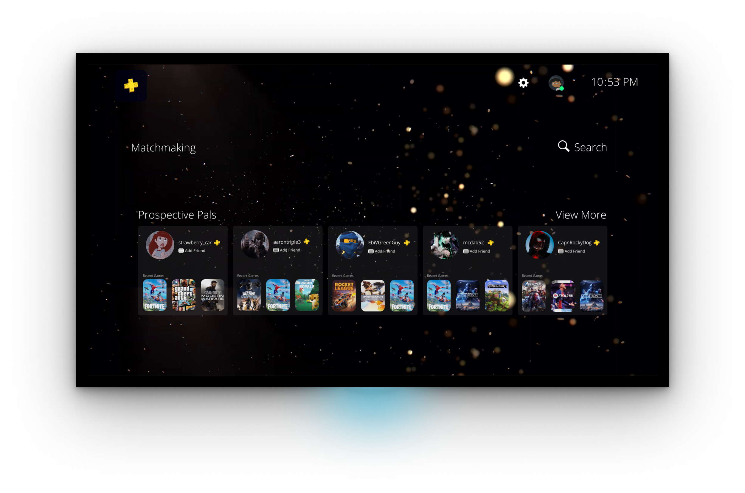 All recent activity lives in the home screen. This is where users can navigate to settings, matchmaking, or friends’ profiles.